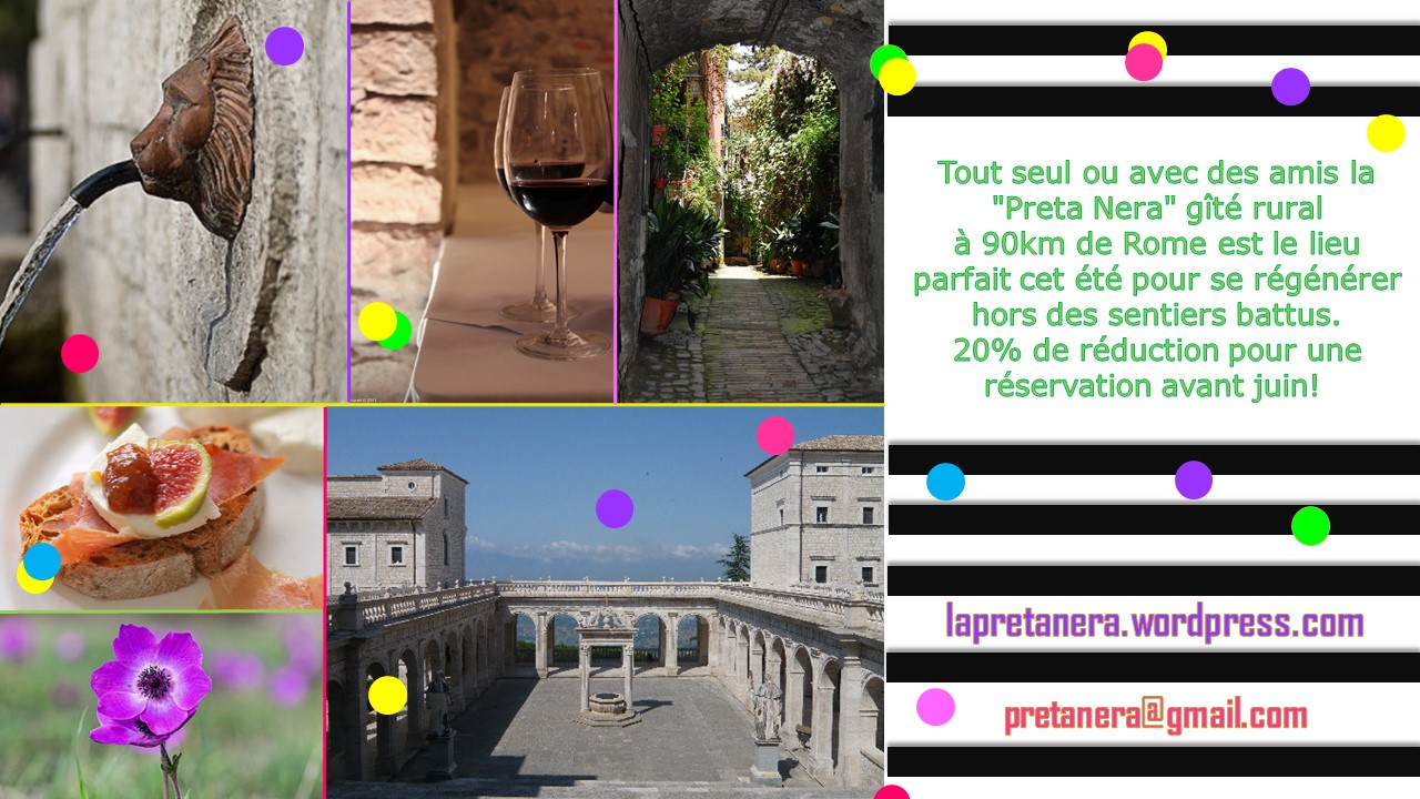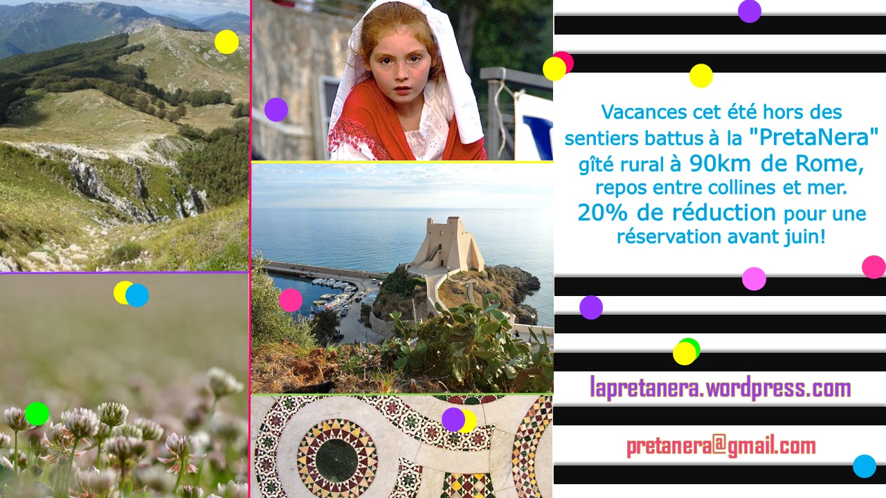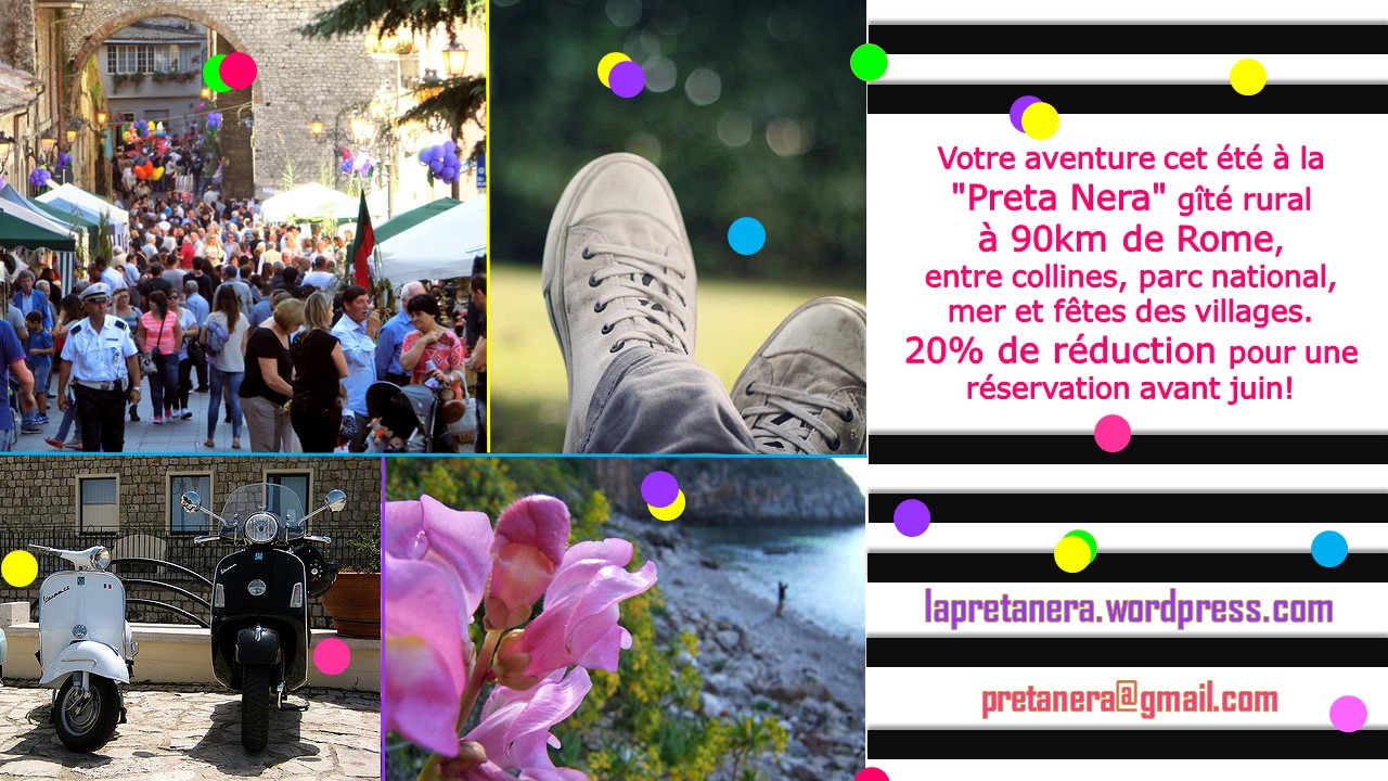 Il faudra bien vous convaincre d’une chose très simple ici à la « Preta Nera » nous sommes dans un’ environnement naturel, rural et gastronomique propice à de vacances d’été hors de sentiers battus et pour tous types des exigences et besoins : les familles, le « solitaire » et ou avec des amis et bien entendu pour les plus jeunes … car la notre géographie (collines, bois, rivières, mer, monuments historiques et un parc national, pas très loin, ( parc national des Abruzzes le plus ancien d’Europe ) et notre 100% de soleil sont un véritable atout pour vos vacances … il y a aussi les fêtes des villages et des vallées, pendant ce période, qui sont un véritable bonheur pour retrouver de la convivialité et découvertes gastronomiques… trois paroles résument cette atmosphère : « Nature » « Repos » « Amour »…. et n’oubliè pas tout est beaucoup moins cher de 20% ici !